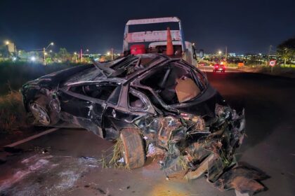Carro ficou completamente destruído após capotamento no Anel Viário Sul de Uberlândia…