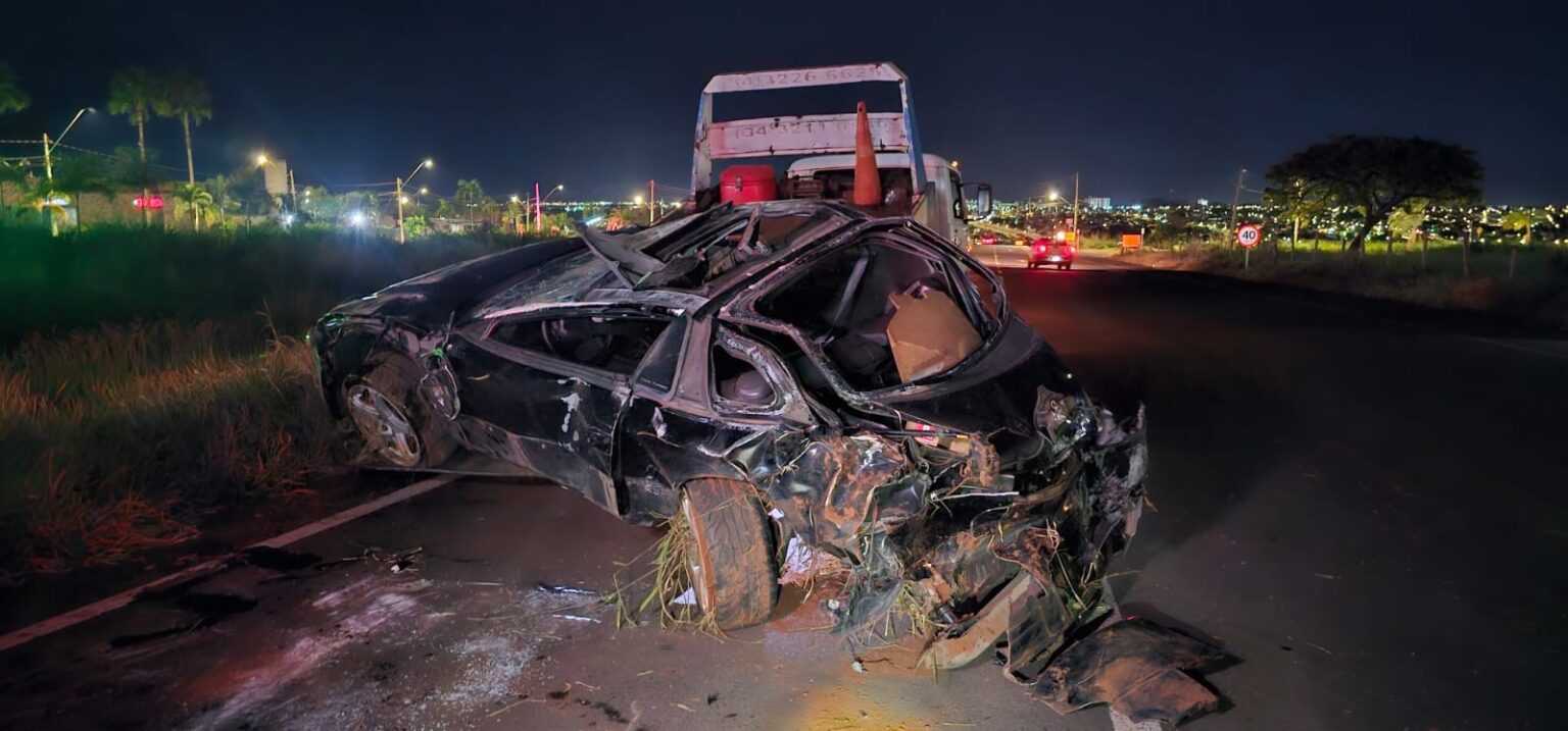 Carro ficou completamente destruído após capotamento no Anel Viário Sul de Uberlândia