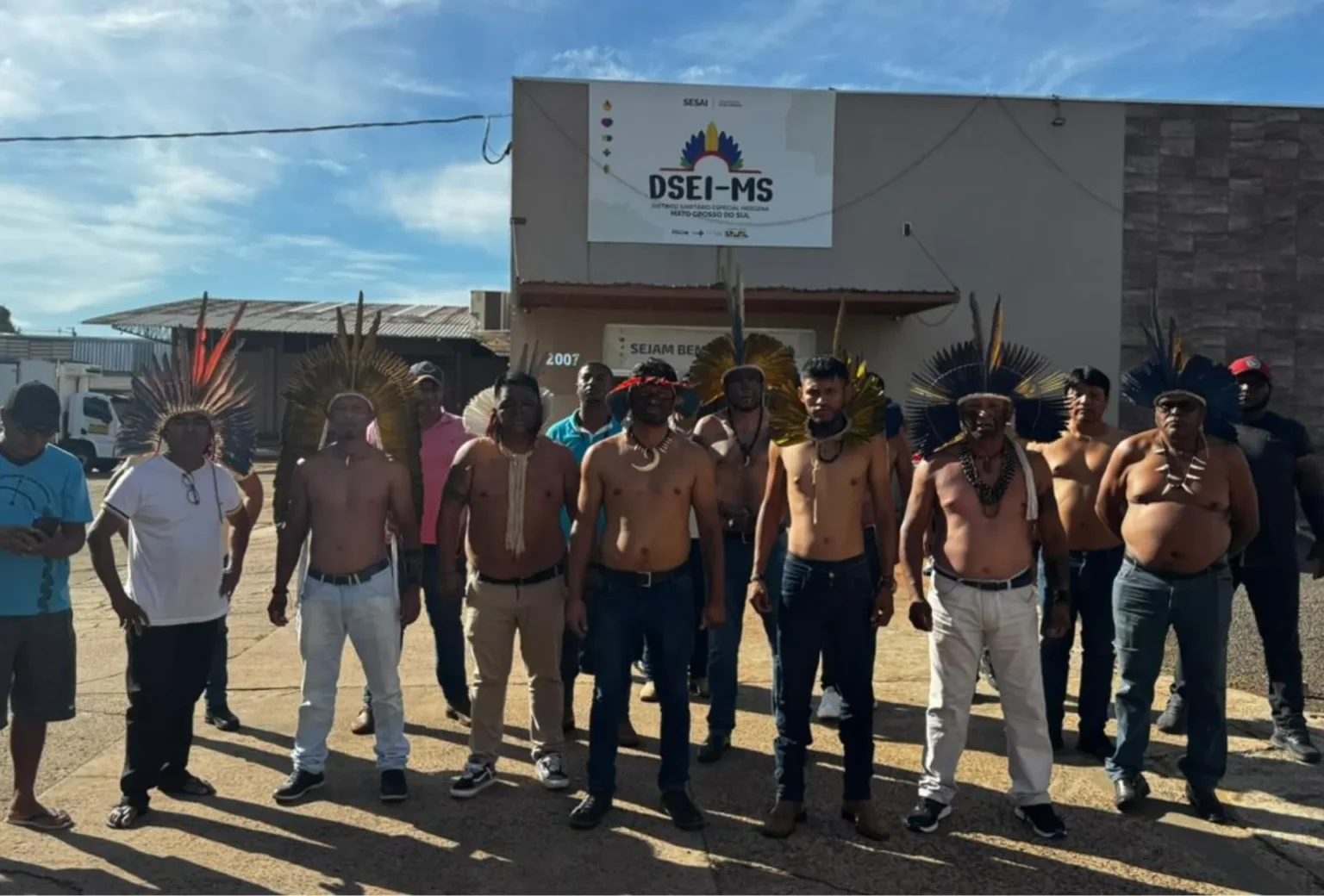 Cerca de 35 caciques e lideranças, principalmente do Pantanal e da região Norte, estão acampados na sede. Eles afirmam que o transporte de pacientes foi suspenso após o fim do contrato com uma empresa privada, que prestava o serviço há oito anos.